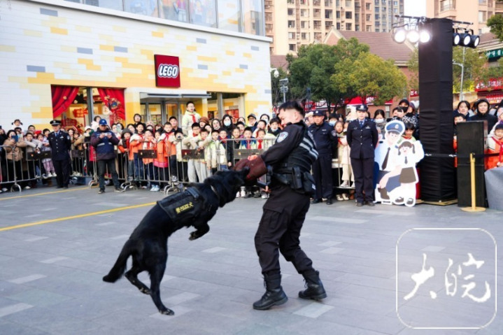 在活动现场,警犬“啸天”在训导员的口令下坐、卧、立、随行,动作精准。它的钻火圈表演将现场气氛推向了高潮,引发观众惊呼。大皖新闻记者采访了解到,“啸天”是一只马犬,两岁半的它已有两年警龄。